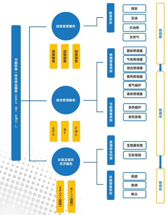 公司主要服务于玻璃、建材、化工、冶金等工业领域,主营工业燃气、城市燃气、交通能源、能源贸易、分布式能源站、能效管理、环保工程,为工业客户提供能源供应、技术研发、工程设计、工程施工与运营管理等综合服务。