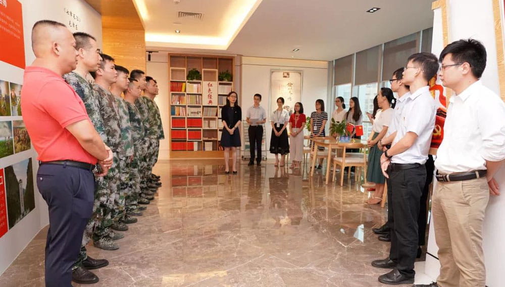 为让大家重温党的发展历程,学习人民军队“特别听党话、特别能奉献、特别能吃苦、特别守纪律、特别能战斗”的精神,升旗仪式结束后,集团副总裁李利玲带领大家到丰乐中心6楼党建展厅进行参观学习并合影留念 。