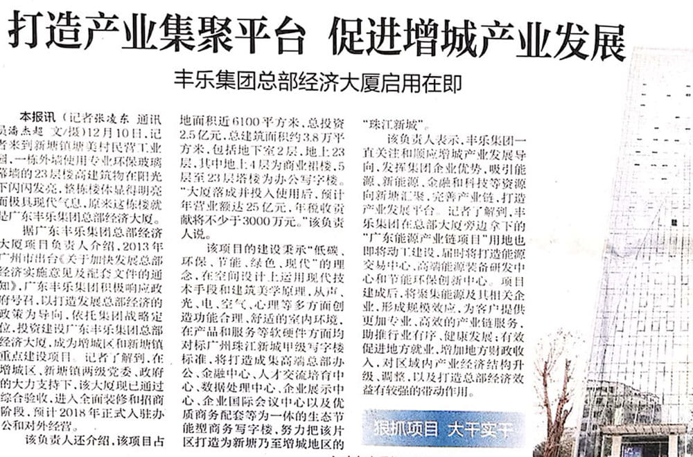 【增城日报】打造产业集聚平台·促进增城产业发展——丰乐集团总部经济大厦启用在即